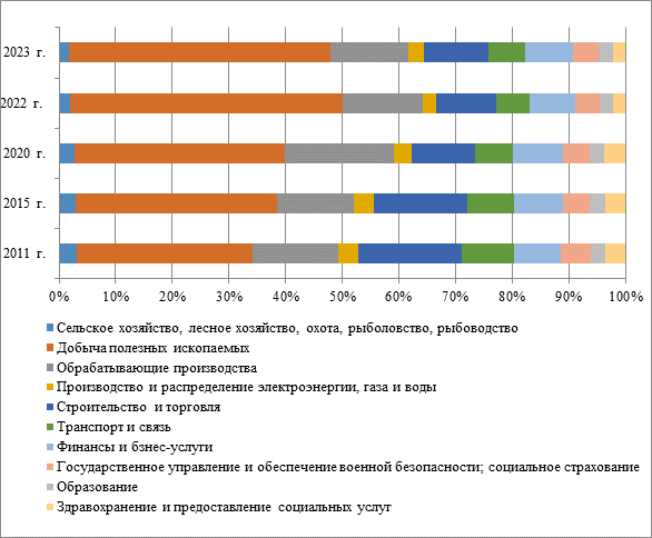 Специфика отраслевой структуры экономики регионов российской Арктики, зависимость ее от геополитической ситуации обусловливают высокую степень уязвимости к воздействию внешних рисков и угроз. Анализ отраслевой структуры валового регионального продукта показывает увеличение роли добывающего сектора в структуре экономики: с 2011 по 2023 гг. доля добычи полезных ископаемых возросла с 31,1% до 46,1% (рис.1). Сохранение доминирования ресурсного сектора, основанного на добыче невозобновимых природных ресурсов, создает дополнительные риски долгосрочного развития.