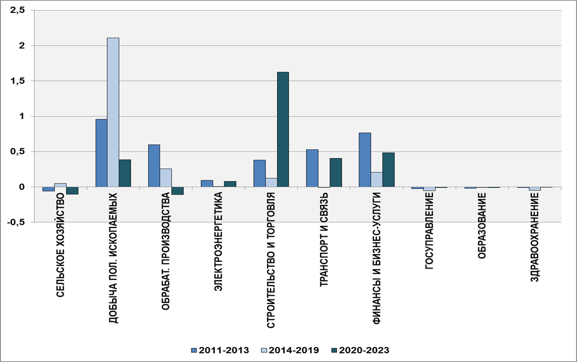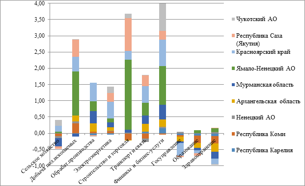 Экономический рост наблюдается во всех секторах экономики, за исключением сельского хозяйства и сектора нерыночных услуг (образование, здравоохранение, государственное управление). Основной вклад в экономический рост внесли добыча полезных ископаемых, строительство и торговля, финансы и бизнес-услуги. При этом вклад добычи был обусловлен долей отрасли в ВРП, а вклад строительства, финансов и бизнес-услуг - темпами роста. Это может свидетельствовать о высоких рисках долгосрочного развития, обусловленных сырьевой зависимостью экономики Арктики.