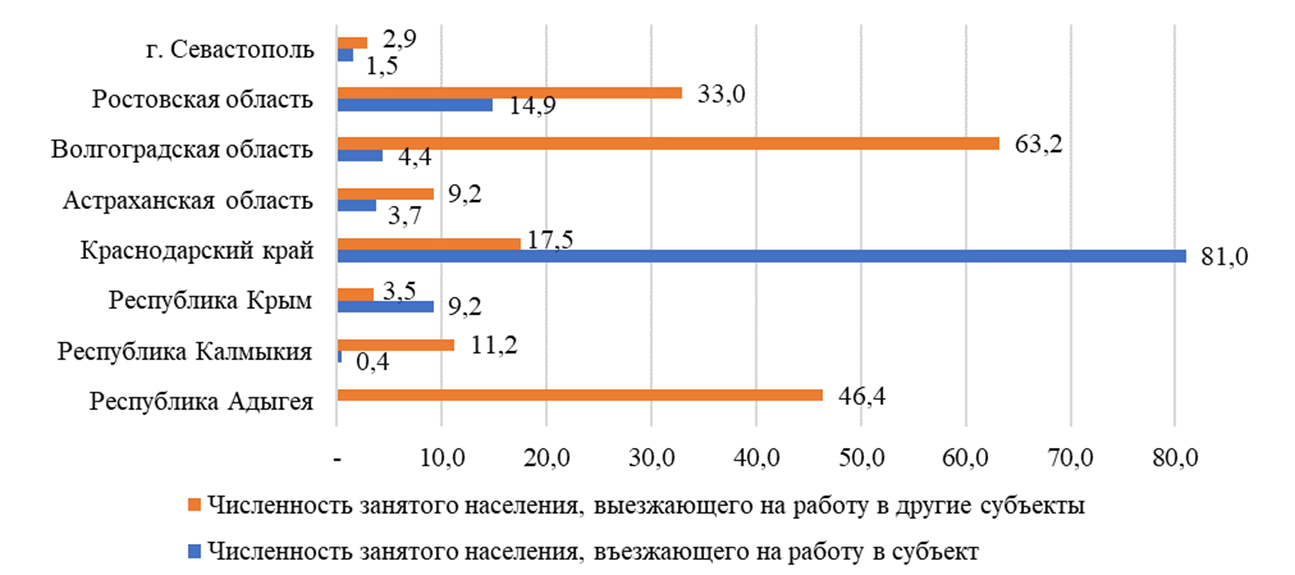 На базе данных федеральной статистики изобразим межрегиональную трудовую миграцию занятого населения по регионам ЮФО (рисунок 1) [14]. Данный федеральный округ занимает важное место в миграционной политике нашего государства, выступая как центром притяжения мигрантов из других стран и регионов, так и регионом, откуда население уезжает.