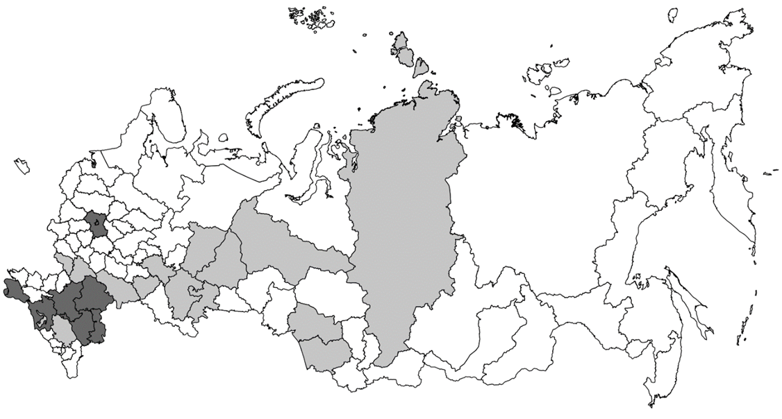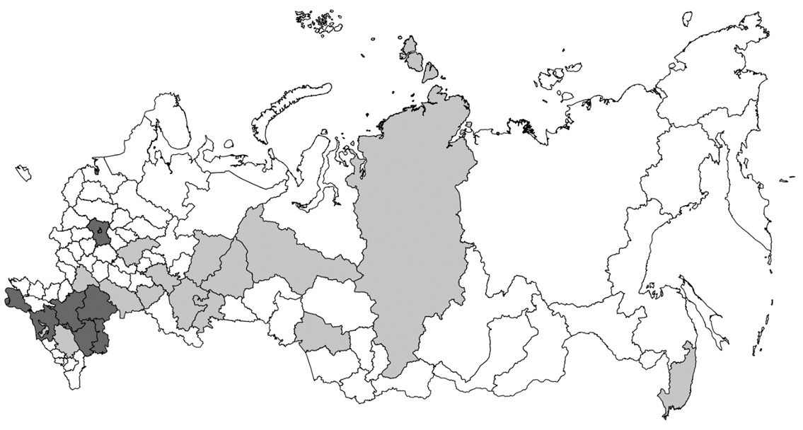 Начнем обзор межрегиональных перетоков трудовых ресурсов ЮФО с позиции того, что регионы исследуемого федерального округа являются регионами-притяжения (рисунок 2). Темно-серым цветом на картограмме представлены регионы, из которых переток трудовых ресурсов больше 280 записей базы данных (среднее выборочное значение). Светло-серым цветом на картограмме представлены регионы, из которых переток трудовых ресурсов больше 100 записей базы данных (ориентировочно 75-процентиль).