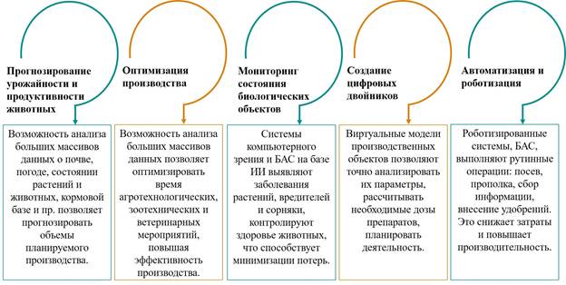 Применительно к сельскохозяйственной отрасли роль ИИ заключается в оптимизации всего процесса производства, обеспечивая решение таких структурных проблем, как дефицит кадров и несоответствие уровня их профессиональной подготовки, сложность технологических процессов, связанных с живыми организмами и специфичными производственными циклами, сложность в прогнозировании показателей деятельности и определении влияния большого количества факторов на данный процесс.