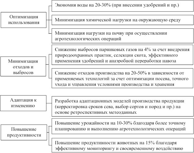 - Экологическую – сохранение здоровья экосистем. ИИ позволяет минимизировать выбросы парниковых газов за счет внедрения природоохранных практик (до 4% за последние 30 лет) [13], снижать отходы производства (до 50%), минимизировать химическую и техническую нагрузку на почву и т. д. Адаптировать производственные агросистемы к изменению климата.