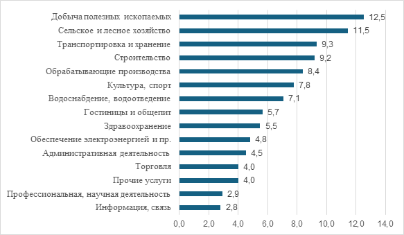Безопасность в сельском хозяйстве в данном случае рассматривается авторами в аспекте минимизации воздействия и сохранение природных систем (что соотносится с параметрами устойчивого развития, описанными ранее) и безопасности условий труда. Следует отметить, что уровень травматизма в отрасли является серьезной проблемой, связанной с высокой степенью риска получения повреждений при работе с сельскохозяйственной техникой, животными в условиях неудовлетворительной организации труда, или неблагоприятных погодных условий. По данным Росстата сельское хозяйство в 2024 г. находилось на 2 месте по числу пострадавших на производстве (рисунок 3).
