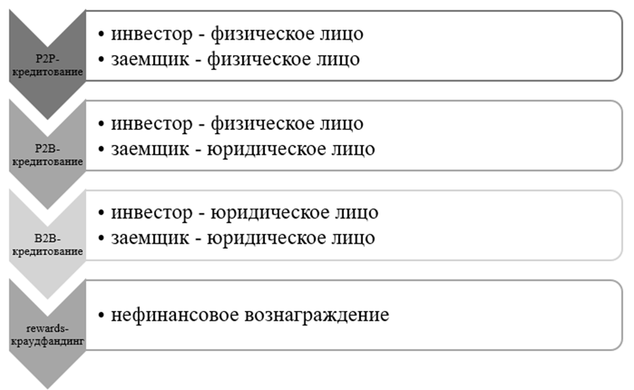 Центральный банк Российской Федерации в зависимости от юридического статуса задействованных лиц в краудфинансировании классифицирует кредитование с помощью инвестиционных платформ следующим образом (рисунок 2):