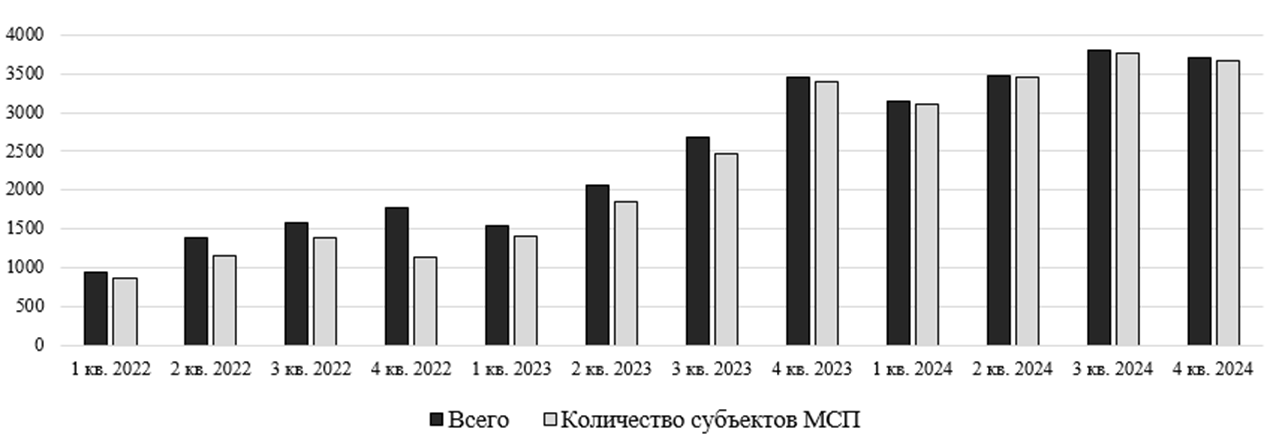 На конец 2021 года объем привлеченного субъектами МСП финансирования равен 10 млрд. руб., на конец 2022 года – 14,3 млрд. руб. (+4,3 млрд. руб. или 43,0%), на конец 2023 года – 30,8 млрд. руб. (+16,5 млрд. руб. или 115,4%), тогда как по итогам работы в 2024 году объем финансирования составил рекордные для анализируемого периода 48,5 млрд. руб. (+17,7 млрд. руб. или 57,5%). [2]