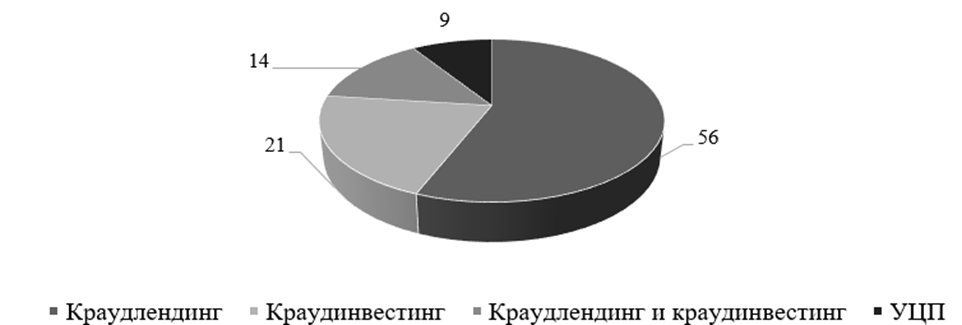 В разрезе инструментов финансирования операторы инвестиционных платформ распределены согласно информации Банка России: