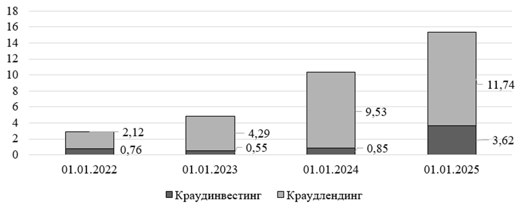 Согласно статистике Банка России по состоянию на 01.01.2025 г. объем привлеченных денежных средств субъектами малого и среднего предпринимательства с помощью краудлендинга вырос до 11,74 млрд. руб. по сравнению с началом 2022 года (2,12 млрд. руб. соответственно). При этом можно выделить рост интереса к краудинвестингу по состоянию на 01.01.2025 г. (практически в 5 раз по сравнению с данными на 01.01.2022 г.). [2]