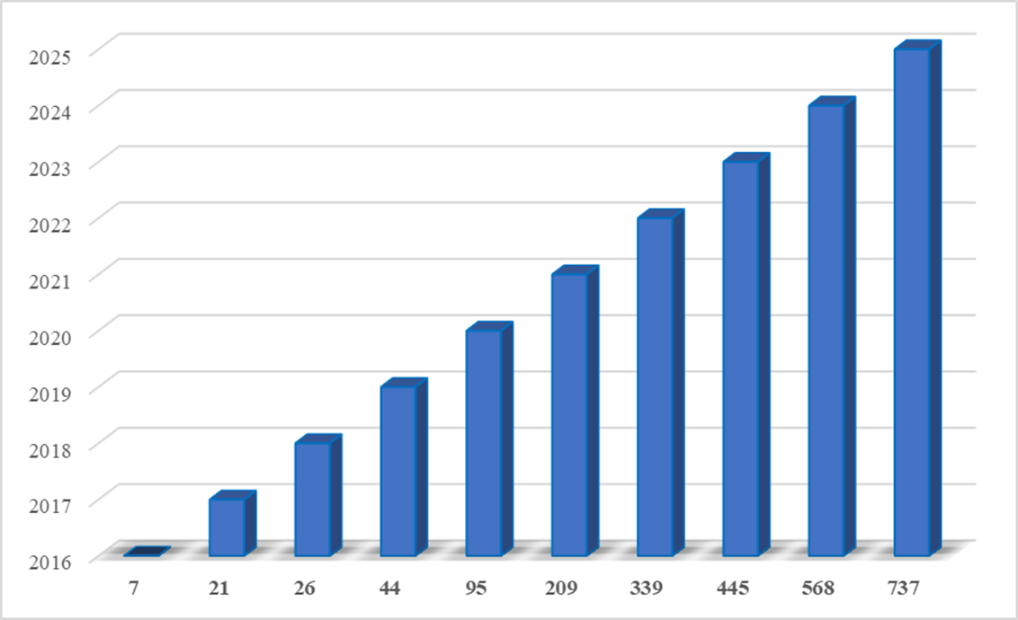 В момент запуска новой формы налогового контроля в виде налогового мониторинга в режиме пилотного проекта количество участников составило 7 компаний. В 2025 году количество организаций, присоединившихся к системе налогового мониторинга, достигло 737, что представляет собой увеличение на 23% или 169 организаций по сравнению с аналогичным периодом 2024 года [12], [14], [15]. Данный рост свидетельствует о возрастании интереса бизнеса к цифровым формам взаимодействия с налоговыми органами, а также отражает стремление компаний к повышению прозрачности и автоматизации процедур налоговой отчетности. Новые участники системы представлены различными отраслями экономики, что подчеркивает универсальность налогового мониторинга и его привлекательность для организаций различных отраслей. Количество участников за период 2016-2025 гг. отражено на рисунке 1.