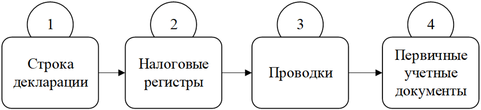 Данная схема иллюстрирует последовательный переход от агрегированного показателя, отраженного в налоговой декларации, к его документальному подтверждению на уровне первичных учетных документов. Механизм включает следующие уровни: