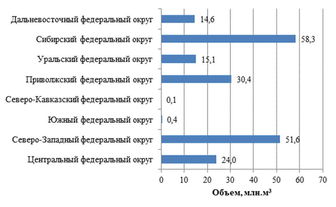 В ходе исследования авторами выделен крайне важный аспект современного состояния информации касательно лесотранспортных потоков, заключающийся в недостаточной информационной прозрачности и наличия (наполнения) информационных баз сведениями о состоянии предметной области. Сведения о лесотранспортных потоках минимальны и крайне разрознены. Учитывая колоссальные объемы древесных ресурсов, заготавливаемых (рис. 1), а, следовательно, и перемещаемых, информация для эффективного управления ими и принятия должных мер регулирования на государственном, региональном и частном уровнях является крайне актуальной.