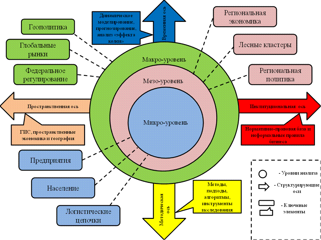 Примером реализации данной модели может служить современная ситуация, когда санкционные ограничения (макро-уровень) привели к изменению логистических цепочек конкретных предприятий (микро-уровень), что в свою очередь привело к развитию инфраструктурных объектов (транспортные сети, склады, хабы, порты и т.д.) в одних регионах и одновременному кризису таких объектов в других субъектах страны, ранее ориентировавшихся, например, на европейского потребителя (мезо-уровень). Вполне логично, что исследование данной ситуации затрагивает пространственные (например, региональные различия), временные (динамика показателей во времени, прогнозы и др.), институциональные (ответные меры Правительства страны, поддержка лесного бизнеса путем субсидирования и т.п.) и методические (научно обоснованный инструментарий исследования) вопросы (оси).