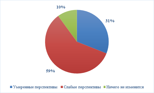 Опросы, проведенные в страховом сообществе, отражают пессимистичные ожидания (см. рисунок 1) относительно возможности выхода на перестраховочные рынки дружественных стран в ближайшие два года. 10% опрошенных утверждают, что такой выход невозможен. По мнению 59% респондентов, перспективы выхода на эти рынки являются слабыми. И только 31% участников опроса видит умеренные перспективы для осуществления этого процесса.
