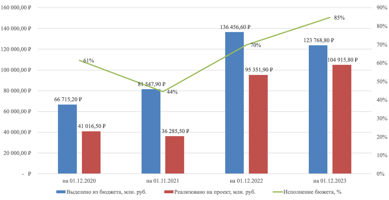Рисунок 2 — Исполнение федерального бюджета в части ассигнований, предусмотренных на реализацию национального проекта «Экология», за период с 2020-2023 гг. [составлено авторами на основе 17]