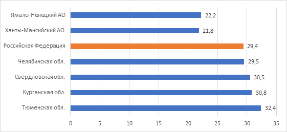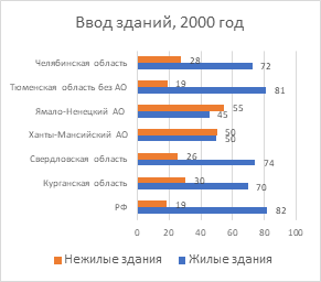 Ввод жилья на душу населения, напротив, в регионах округа ниже среднероссийского значения кроме Свердловской и особенно Тюменской области, в последней ввод на душу населения более чем в два раза превышает средний показатель ввода по РФ, что говорит о высокой строительной активности данных территорий.