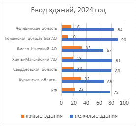 Оказываемая значительная государственная поддержка строительной отрасли привела к существенной трансформации строительного рынка. В 2024 году общая площадь недвижимости, введенной в эксплуатацию на территории России, составила 170 млн кв. м. более 20 % из которых приходится на нежилые здания. В УФО структура ввода соответствует общероссийской. Основную долю 82% составляют жилые здания, нежилые – 18%. Однако, структура ввода зданий в регионах УФО имеет существенные различия и определяется завершением строительства крупных объектов и преобладающей формой расселения. Так, существенно выше средней по стране доля введенных нежилых зданий в Ямало-Ненецком автономном округе (ЯНАО) (33,0%), из которых 18,0% приходится на промышленные здания, 12% на учебные. Существенно ниже средней по стране доля введенных нежилых зданий в Тюменской области (10,0%) и Челябинской области (16,0%). Выше средней по стране доля введенных жилых зданий среди регионов УФО наблюдается в 2024 году в Свердловской области (80,0%), Ханты-Мансийском автономном округе (ХМАО) (81,0%), Тюменской области (90%) и Челябинской (84,0%). (таблица 1)