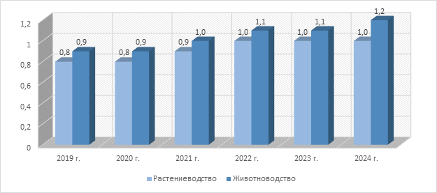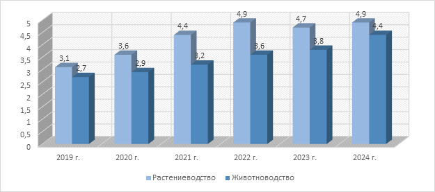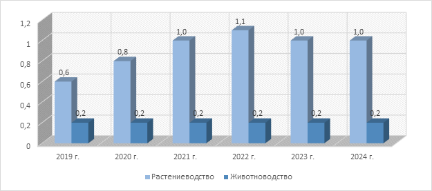 Доля крестьянских (фермерских) хозяйств в общем объеме выпущенной сельскохозяйственной продукции в хозяйствах всех категорий показала нисходящую тенденцию, спад которой в 2024 году составил 4,1% (-0,6 п.п.), достигнув значения в 14,2%. Тем не менее по показателям производства наблюдается устойчивость относительно значений 2023 года, составляя 1,2 трлн. руб., включая объемы производства в растениеводстве – 1 трлн. руб. и в животноводстве – 0,2 трлн. руб. (рис. 4).