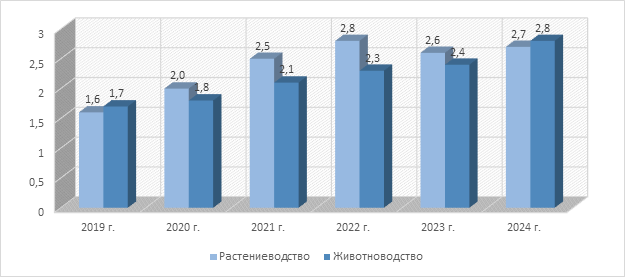 Доля сельхозорганизаций в общем объеме выпуска продукции сельского хозяйства в хозяйствах всех категорий имела тенденцию к небольшому подъему на 0,8% (+0,5 п.п.) и в 2024 году составила 60,4%, что подтверждается увеличением производственных объемов на 10% (+0,5 трлн. руб.) до уровня 5,5 трлн. руб., включая рост объемов производства животноводства на 16,7% (+0,4 трлн. руб.) до отметки в 2,7 трлн. руб. В то же время производственные показатели растениеводства в 2024 году продемонстрировали относительно невысокий рост в 3,8% по отношению к уровню 2023 года, составив 2,7 трлн. руб. (рис. 2).