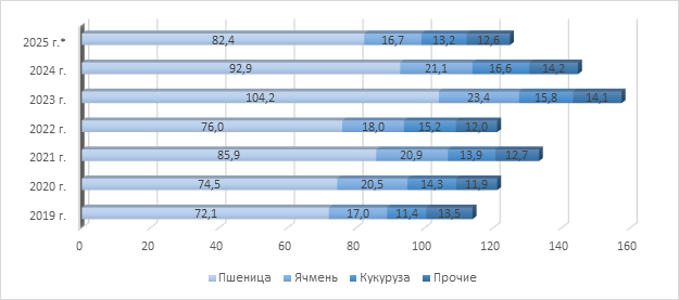 Рисунок 5. Показатели валового урожая зерновых культур в России за 2019-2025 гг., млн. тонн