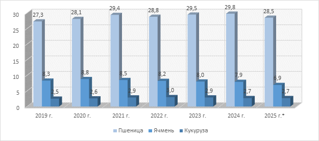 Рисунок 6. Размер посевной площади основных зерновых культур в России за 2019-2025 гг., млн. га