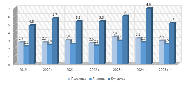 Рисунок 7. Показатели урожайности основных зерновых культур в России за 2019-2025 гг., тонн/га
