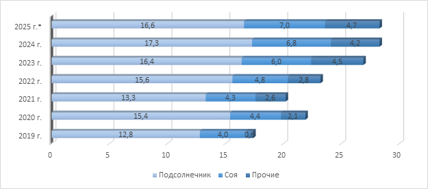В соответствии с предварительными данными Росстата, в 2025 году урожай масличных культур неизменные результаты по сравнению с 2023 годом, составив 28,3 млн. тонн. При этом в структуре урожая масличных культур наблюдается уменьшение сбора подсолнечника на 4% (-0,7 млн. тонн) до 16,6 млн. тонн, что было восполнено увеличением урожая сои на 2,9% до 7 млн. тонн (+0,2 млн. тонн) и прочих масличных культур – на 11,9% (+0,5 млн. тонн) до 4,7 млн. тонн [4] (рис. 8).