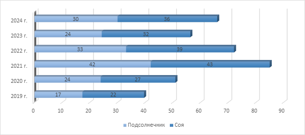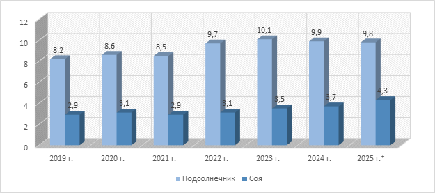 Площадь посевов масличных культур в 2025 году в натуральном объеме подверглась увеличению на 3,7%, достигнув 14,1 млн. га (+0,5 млн. га). Посевная площадь подсолнечника сократилась на 1% (-0,1млн. га) до 9,8 млн. га, тогда как посевная площадь сои выросла на 16,2% (+0,6 млн. га) до 4,3 млн. га. Данная динамика связана с возрастающим потребительским спросом на растительные масла и улучшением экономической эффективности данных культур [4] (рис. 9).