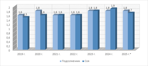 Рисунок 10. Показатели урожайности основных масличных культур в России за 2019-2025 гг., тонн/га