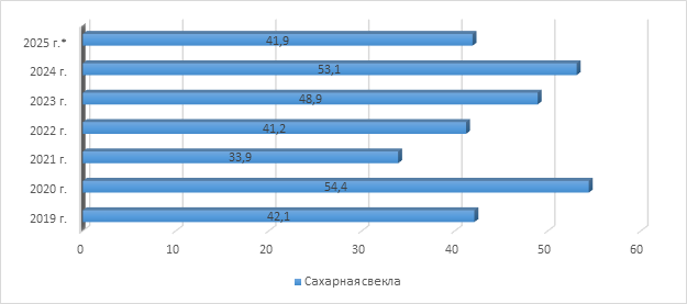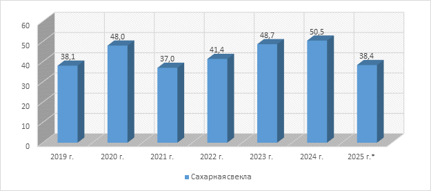 Рисунок 11. Показатели валового урожая сахарной свеклы в России за 2019-2025 гг., млн. тонн