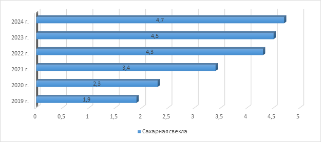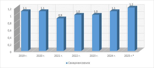 Рисунок 12. Размер посевной площади сахарной свеклы в России за 2019-2025 гг., млн. га