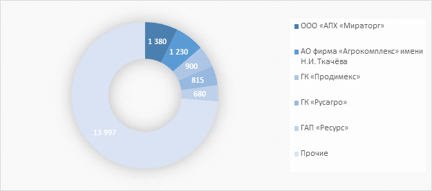 Согласно данным аудиторско-консалтинговой компании «BEFL», по состоянию на апрель 2025 года во владении пяти крупнейших землевладельцев России находилось 5 млн. га сельскохозяйственных угодий. За 2025 год топ-5 агрокомпаний расширили свои земельные активы на 437 тыс. га. Лидером рейтинга традиционным образом стал лидер мясной индустрии в России – «Мираторг», земельный банк которого оценивается в 1 380 тыс. га. (+159 тыс. га). На втором месте расположился «Агрокомплекс» имени Н.И. Ткачева, известный как один из лидеров в стране по производству молока, сахара и мяса, с совокупным земельным баном в 1 230 тыс. га (+104 тыс. га), а третью позицию занял «Продимекс» – ведущий производитель белого сахара в России с площадью сельхозземель 900 тыс. га. [7] (рис. 14).