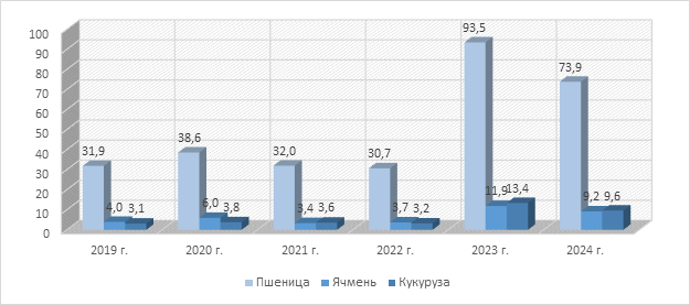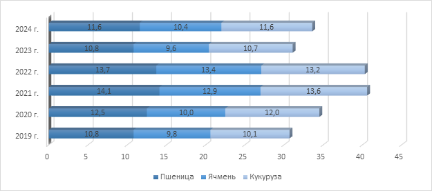 Рисунок 15. Показатели объема российского экспорта основных зерновых культур за 2019-2024 гг., млн. тонн