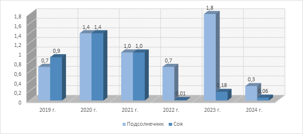 Рисунок 18. Показатели объема российского импорта основных сельскохозяйственных культур за 2019-2024 гг., млн. тонн