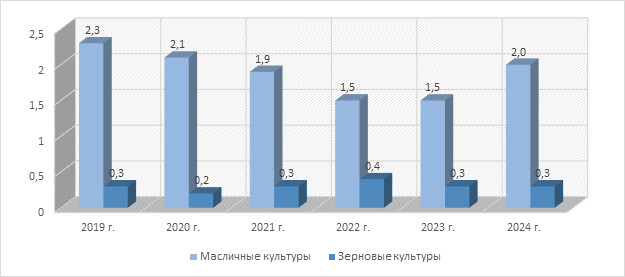 Урожайность масличных культур в 2025 году продемонстрировала спад на 5,4% (-0,2 тонн/га) по отношению к 2024 году, составив 3,5 тонн/га, в том числе урожайность сои – на 10,5% (-0,2 тонн/га) до 1,7 тонн/га. При этом урожайность подсолнечника не подверглась изменениям и осталась на прежнем уровне, составляя 1,8 тонн/га. Падение урожайности масличных культур преимущественно сопряжено с неудовлетворительными климатическими факторами [4] (рис. 10).