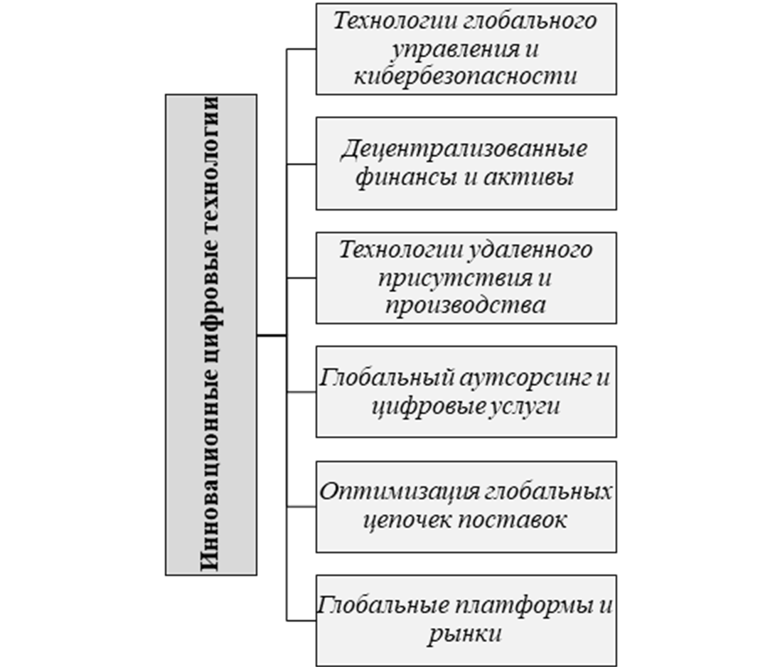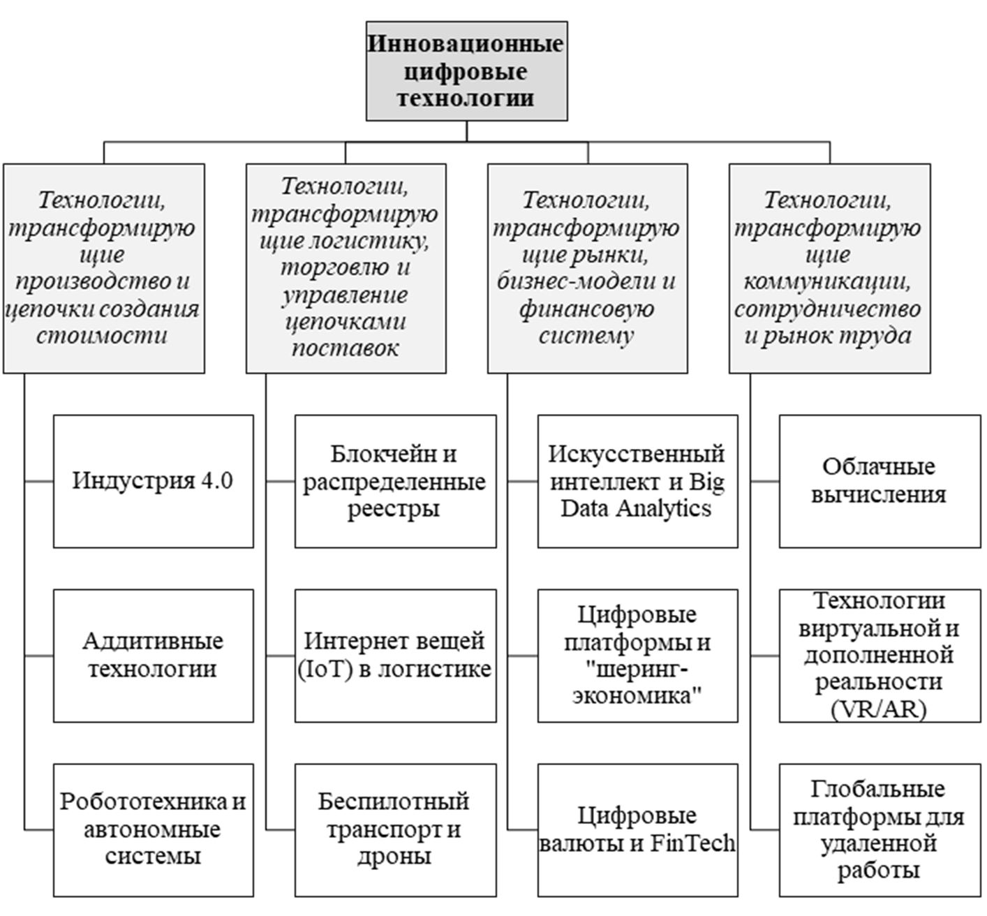 В данном исследовании было определенно, что инновационные цифровые технологии являются не просто инструментом оптимизации производства или повышения эффективности предоставления услуг, но и качественно новым и системообразующим фактором развития мировой экономики, а также мирохозяйственных процессов. Данный исследуемый объект осуществляет трансформацию моделей производства, логистики, торговли, финансов, коммуникаций, что формирует новую парадигму глобального экономического взаимодействия. В соответствии с проведенным теоретическим анализом была разработана авторская классификация инновационных цифровых технологий, которая формируется в зависимости от типа трансформации в части производства и цепочек создания стоимости; логистики, торговли и управления цепочками поставок; рынков, бизнес-моделей и финансовой системы; коммуникации, сотрудничества и рынка труда.