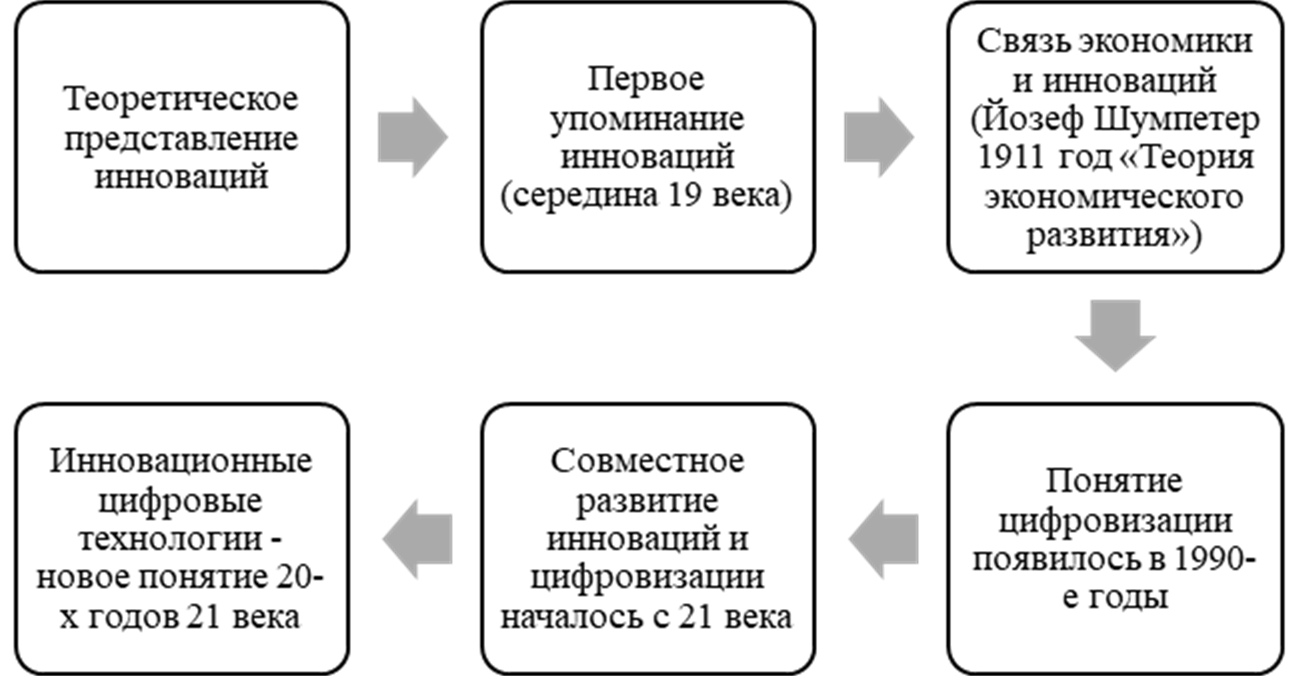 Цепочка развития теоретического представления инноваций и цифровизации заканчивается образованием научной базы для исследования инновационных цифровых технологий. Изучаемые технологии, как уже было сказано, являются более обширным объектом исследования, в сравнении с цифровизацией и инновациями. Инновационные цифровые технологии представляют собой систему, объединяющую цифровизацию и инновации, как форму развития новых технологических решений.
