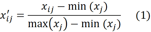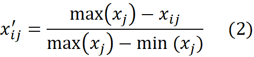 2. Нормализация данных методом экстремумов (как для (максимизируемых) – (1) показателей, так и для отрицательных (минимизируемых) – (2)):