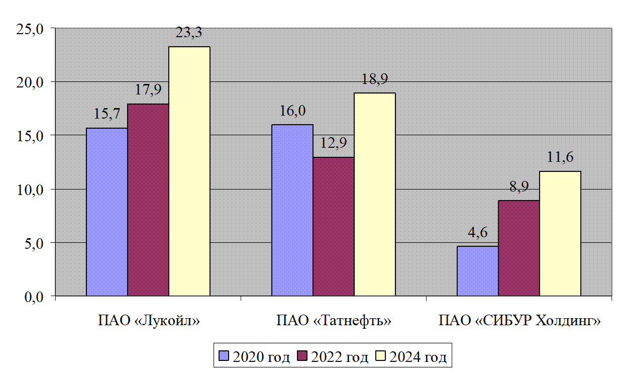 Динамика расходов на экологические проекты в рамках устойчивого развития в ПАО «Лукойл» и в ПАО «СИБУР Холдинг» за 2020–2024 гг. В ПАО «Лукойл» объем данных расходов вырос с 15,7 млрд. руб. до 23,3 млрд. руб. (плюс 48,4%), а в ПАО «СИБУР Холдинг» с 4,6 млрд. руб. до 11,6 млрд. руб. (плюс 152,2%). Несмотря на экономический стресс в санкционных условиях данные предприятия продолжили наращивать внедрение практики циркулярной экономики. В ПАО «Татнефть» в 2022 году было сокращение с 16 млрд. руб. до 12,9 млрд. относительно 2020 года, а в 2024 году объем данных расходов вырос до 18,9 млрд. руб. (плюс 18,2% относительно 2022 года). Соответственно, ПАО «Татнефть» после введения санкций сократила данный вид расходов, но снова его нарастила к 2025 году.