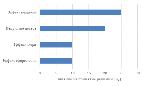 В последние десятилетия наблюдается переход от теоретического признания роли поведенческих факторов к их активной интеграции в практику менеджмента. Инструментарий поведенческой экономики предоставляет ревеню-менеджерам возможность целенаправленно влиять на потребительские решения, повышая конверсию, средний чек и лояльность клиентов. В основе этого влияния лежат систематические когнитивные искажения, которые, будучи принятыми во внимание, становятся мощными рычагами оптимизации доходности. На рисунке 1 представлено распределение основных поведенческих факторов, оказывающих влияние на принятие решений в управлении рисками на микроэкономическом уровне. Рисунок представляет собой иллюстративную модель, которая показывает распределение влияния основных поведенческих факторов на принятие решений в управлении рисками. Данные на диаграмме следует интерпретировать не как результат конкретного эмпирического опроса, а как количественную оценку относительной важности каждого из факторов, предложенную авторами на основе анализа теоретических концепций. Каждый фактор представлен в виде процента от общего влияния, подчеркивая важность таких аспектов, как ограниченная рациональность, предпочтение статуса-кво и страх перед риском [5, с.26].