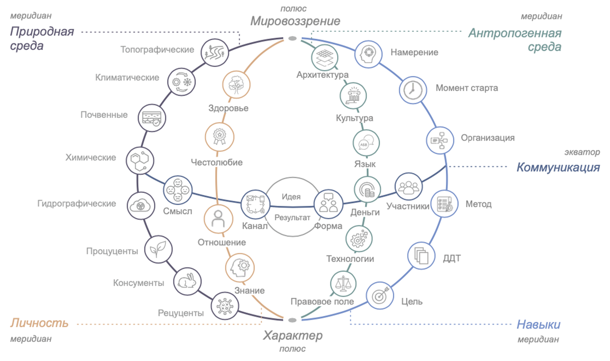 Авторская концепция «Глобус возможностей» (Рис. 1) представляет собой интегрированную модель, объединяющую четыре ключевых меридиана — Природную среду и Антропогенную среду, с одной стороны, и Личность и Навыки – с другой. На полюсах глобуса находятся Мировоззрение и Характер. В ядре содержатся Идея и Результат, обозначающие начальную мотивацию и конечную цель волевой, целенаправленной, стратегической деятельности [3, 6, 9]. Такое представление позволяет увидеть, как ресурсы, качества и условия взаимодействуют между собой, формируя путь от замысла к реализации, а различные элементы могут стать средствами. Для руководителя это становится фундаментом, позволяющим системно мыслить и целенаправленно развиваться.