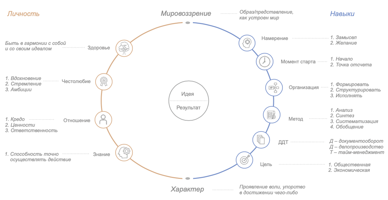 Меридиан «Навыки» охватывает всё, что связано с прикладной деятельностью, управленческим инструментарием и технологией реализации замыслов (Рис. 2). Он начинается с намерения — осознанного внутреннего импульса к действию, за которым следует выбор момента старта. Умение выбрать верный момент позволяет избежать промедления и сформировать устойчивую динамику. Далее ключевыми элементами являются организация, как способность выстраивать эффективные структуры и процессы; метод — выбор логики действия, наиболее подходящей в конкретной ситуации; и цикл ДДТ — Делопроизводство, Документооборот, Тайм-менеджмент, отражающий процесс практического движения к цели [8, 9, 11]. Цель при этом должна быть чёткой, измеримой и связанной с ценностями руководителя. Таким образом, развитие навыков позволяет превращать идею в результат, опираясь на деятельность.