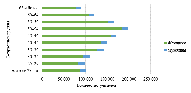 Наибольшая доля женщин приходится на возрастные группы 45–54 лет – 92–93%, что указывает на традиционную роль женщины в сфере образования и отражает социально-экономические особенности профессии. Почти 200 тысяч педагогов находятся в возрасте 50–54 лет — группе, которая в ближайшие годы может массово покинуть профессию. При текущем уровне привлечения молодых кадров (около 100 тысяч педагогов младше 25 лет) к 2030 году прогнозируется дефицит более 300 тысяч ставок [11].