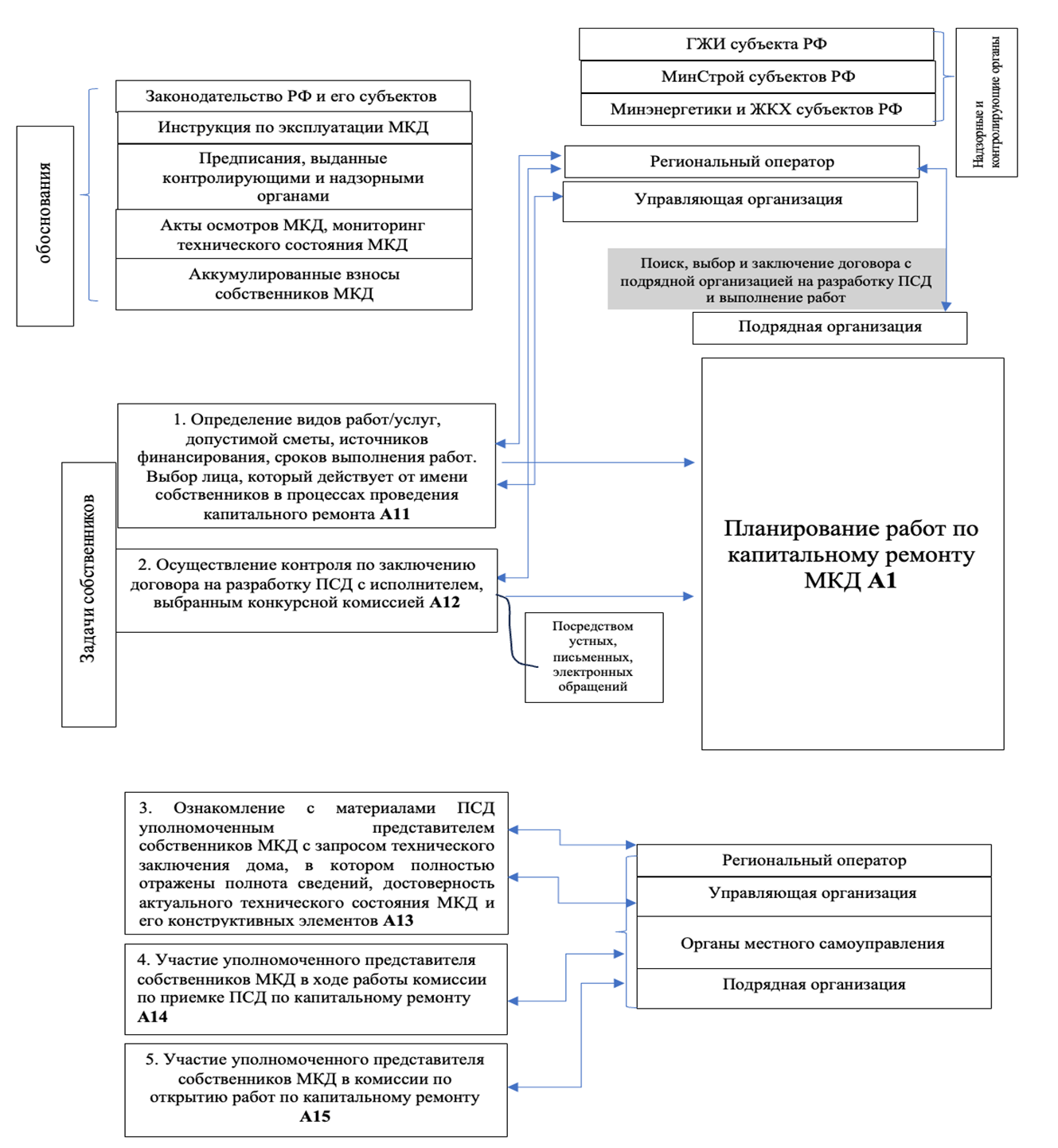 А12. Осуществление контроля за заключением договора на разработку проектно-сметной документации (далее ПСД) с исполнителем, выбранным конкурсной комиссией. На этом этапе региональный оператор по запросу собственников помещений МКД обязан предоставить информацию, содержащуюся в системе учета фондов капитального ремонта [6] относительно выбранной для осуществления капитального ремонта подрядной организации и средств, которые ей перечисляются за эти работы. Результатом этапа А12 является согласование со стороны собственников относительно выбора подрядной организации.