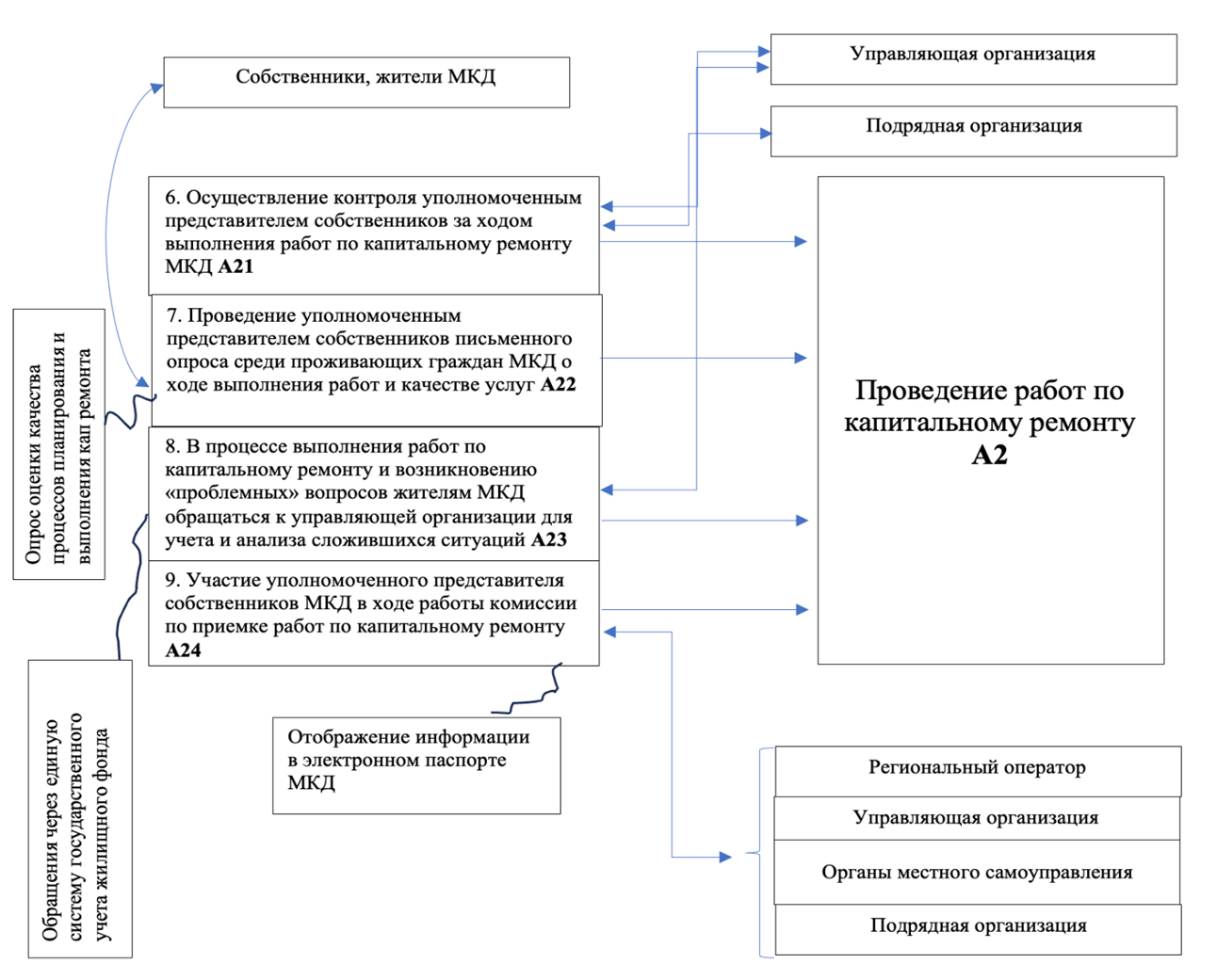 А22. Проведение уполномоченным представителем собственников письменного опроса среди проживающих граждан МКД о ходе выполнения работ и качестве услуг. Данный опрос, проводимый от имени ответственного лица по дому, направлен на получение обратной связи от собственников помещений в ремонтируемом МКД, результаты которого будут служить основой для дальнейших предложений по оптимизации процессов планирования и реализации краткосрочной региональной программы [7].