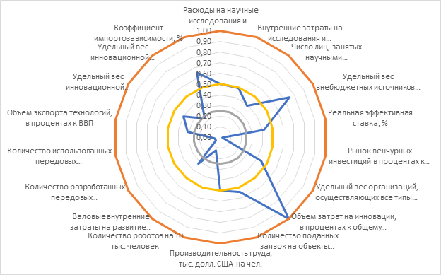 Пороговые значения индикаторов соответствуют нормативным документам Правительства РФ и часто близки к соответствующим показателям промышленно развитых стран. Например, норматив расходов на НИОКР (в процентах от ВВП) – 2 и более процента (согласуется с Постановлением Правительства РФ № 571 от 28.04.2025). В некоторых странах этот показатель существенно выше: в Израиле достигает 5%, в Южной Корее — 4%, но в большинстве развитых стран варьируется в диапазоне 2–2,6%. По доле внебюджетного финансирования НИОКР порог установлен выше 50%, что соответствует вышеприведенному Постановлению Правительства РФ и также согласуется с соответствующими показателями промышленно развитых стран.