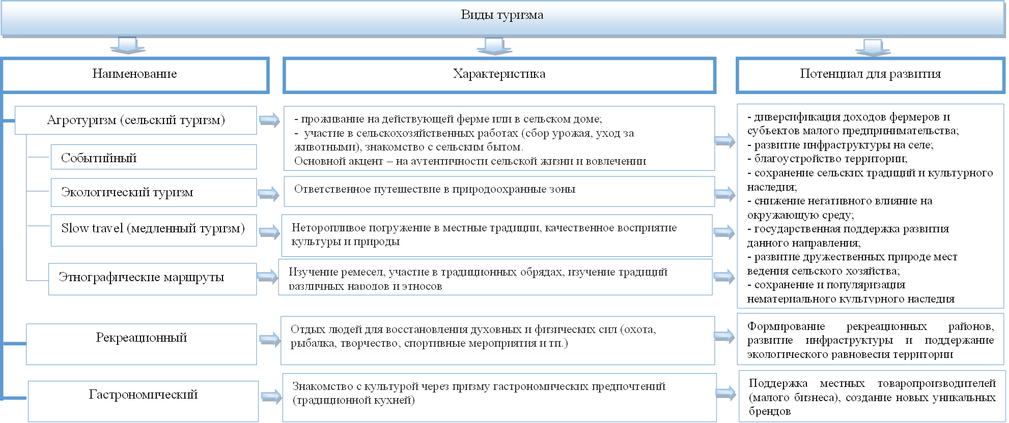 По мнению Строевой А.Г., Иволги А.Г. и Елфимовой Ю.М. [20] сельский туризм является одним из инструментов реализации туристско-рекреационного потенциала страны, развитие которого связано с желанием туристов «выбраться» на село, чтобы отдохнуть от городской суеты. Авторы отмечают, что на развитие сельского туризма влияет ряд факторов, таких как: наличие ресурсного потенциала, развитие инфраструктуры в сельской местности, узнаваемость туристического продукта.