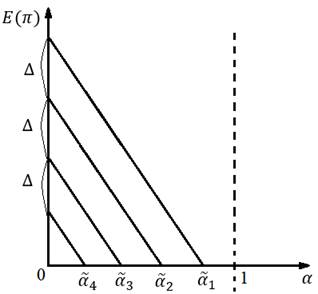 Вероятность обнаружения покупателем дефектов не является величиной теоретической, абстрактной. Напротив, данный показатель может быть чётко определён продавцом на основе статистики продаж и возвратов при наличии достаточной выборки по числу реализованных товаров. Тогда ожидаемая прибыль от продажи товаров ненадлежащего качества может быть представлена в виде «семейства» прямых на координатной плоскости (см. формулы (2), (3) и (4)), где на оси абсцисс отложена вероятность выявления дефектов товара, на оси ординат – значение ожидаемой прибыли. Описанное отражено на рисунке (рис. 1).
