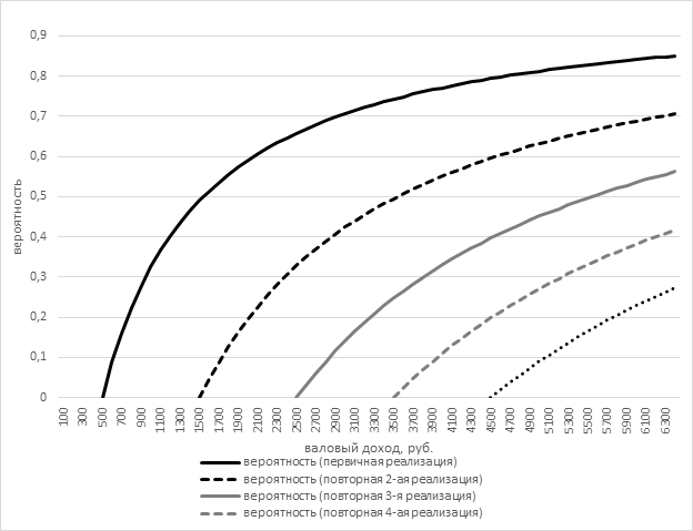 Данные рисунка показывают, что продавец не имеет экономических стимулов к продаже некачественного товара при небольших значениях валового дохода от продажи (ниже 500 руб. в модельном примере), так как убытки в случае обнаружения потребителем дефектов товара перекрывают положительный экономический результат почти при любой вероятности их выявления при проверке на пункте выдачи заказа. При валовом доходе от 1500 руб. недобросовестный продавец имеет экономический интерес к преднамеренной продаже некачественного товара, однако вторичную его реализацию такой продавец рассматривает как слишком рискованную. По мере увеличения валового дохода повышается как значение вероятности, так и количество экономически целесообразных повторных продаж некачественного товара. То есть при высоких значениях торговой надбавки для продавца становятся доступны значения вероятности, лежащие на кривых, расположенных всё дальше от начала координат. Так, анализируя данные рисунка, можно заметить, что при высоких значениях валового дохода недобросовестному продавцу выгодно попытаться реализовать возвращенный некачественный товар даже с 5-ой попытки. Кроме того, при высоких значениях торговой надбавки такому продавцу выгодно реализовывать, в том числе и повторно, некачественные товары с часто выявляемыми покупателями недостатками. Как следствие, при покупке на маркетплейсе ряда категорий товаров потребитель может сталкиваться с некачественным товаром снова и снова, что осложняет процесс покупки и способствует формированию негативного потребительского опыта.
