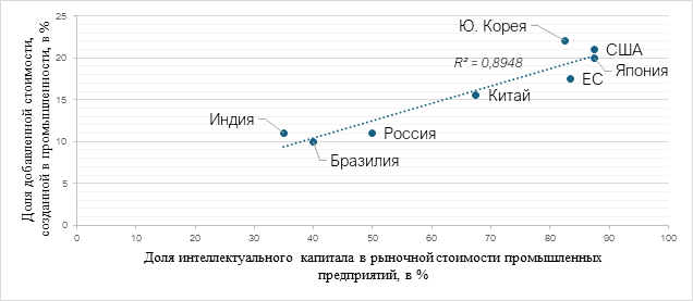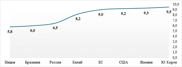 Данные показывают, что обрабатывающая промышленность стран ОЕСD находится на значительно более высоких конкурентных позициях, нежели стран БРИКС за исключением Китая, который занимает срединное положение. Это обусловлено влиянием экономических и правовых институтов, которые, например, в Южной Корее и Японии ориентированы на поддержку высокотехнологичных инвестиций и патентной активности экономических акторов. В США создана уникальная инновационно-инвестиционная экосистема, объединяющая венчурный капитал и университеты (Кремниевая долина).