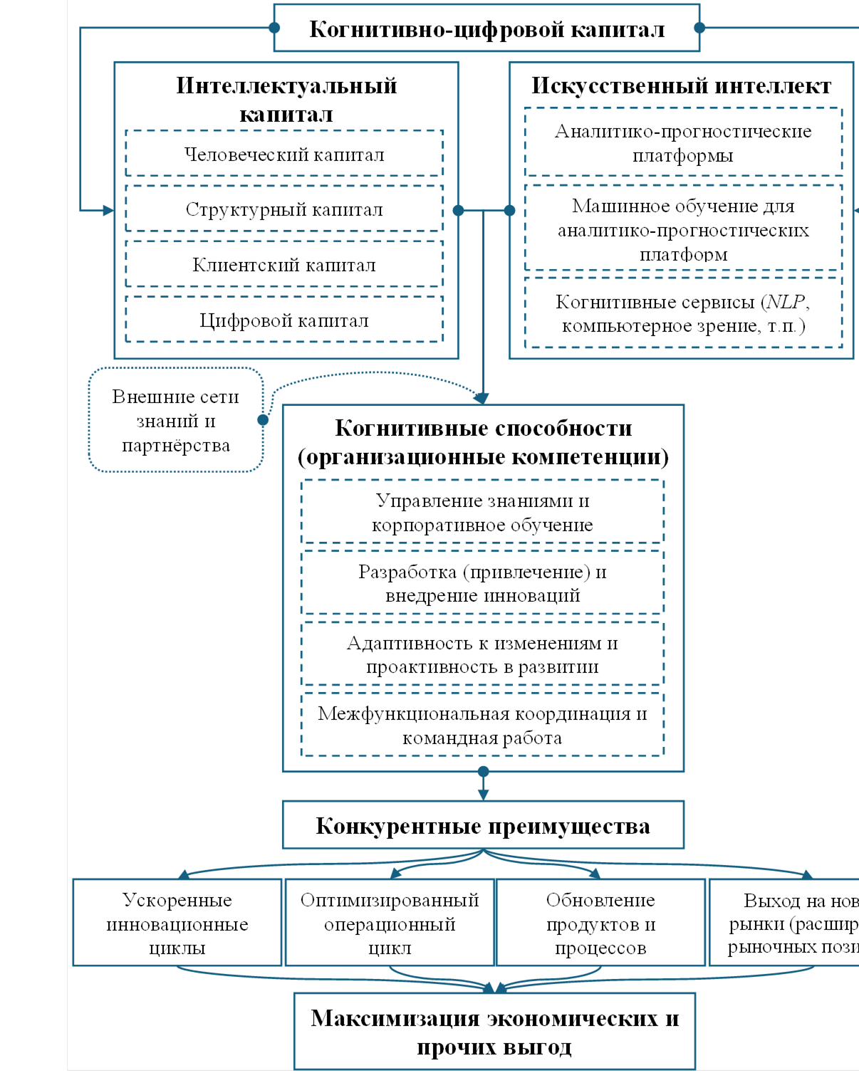 Выводы. Интеллектуальный капитал в связке с искусственным интеллектом является ключевым драйвером конкурентоспособности многопрофильных инновационных промышленных предприятий в эпоху цифровизации. Устойчивое развитие и рыночный успех зависят не столько от концентрации финансового и физического капитала, сколько от способности предприятий быстро и качественно трансформировать когнитивно-цифровой капитал в организационные компетенции и далее в конкурентные преимущества. Представленная модель когнитивно-цифрового контура конкурентоспособности позволяет системно интегрировать инновации, управление знаниями и цифровые технологии в операционные процессы, что сокращает инновационные циклы, повышает экономическую эффективность и расширяет рыночные позиции предприятий.