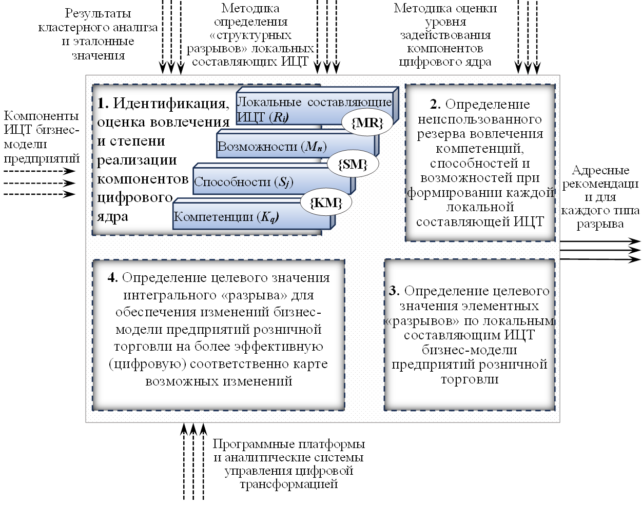 Методологическая основа исследования. В основу исследования легли методы системного и процессного анализа. Методологической основой выступила разработанная автором концепция индекса цифровой трансформации (HIT), включающая три локальные составляющие: цифровую грамотность человеческого капитала (H), цифровые инструменты (I) и цифровую инфраструктуру (T) [6, с. 113-119]. Для визуализации и структурирования бизнес-процесса оценки резервов использовалась методология IDEF0 [2]. Количественная оценка степени задействования компонентов цифрового ядра (компетенций, способностей, возможностей) проводилась с применением экспертных методов балльной оценки и построения матриц взаимовлияния. Расчет величин структурных разрывов и нереализованного потенциала выполнялся на основе авторских формул с применением аппарата теории нечетких множеств и формулы Фишберна [12] для построения идентификационной шкалы.